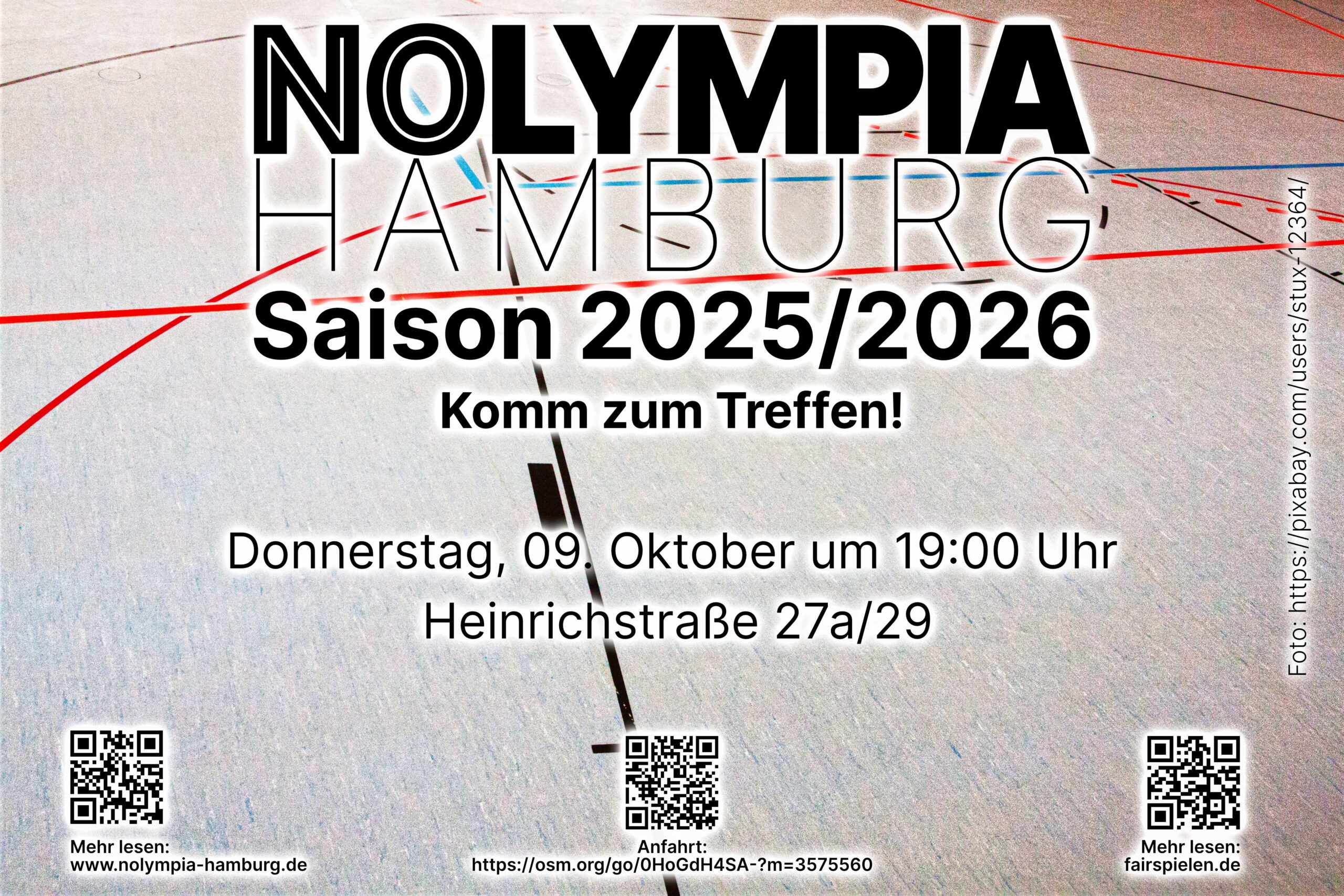 Kommt zum nächsten Treffen von NOlympia Hamburg am 9.10.2025 um 19 Uhr in der Heinrichstraße 29