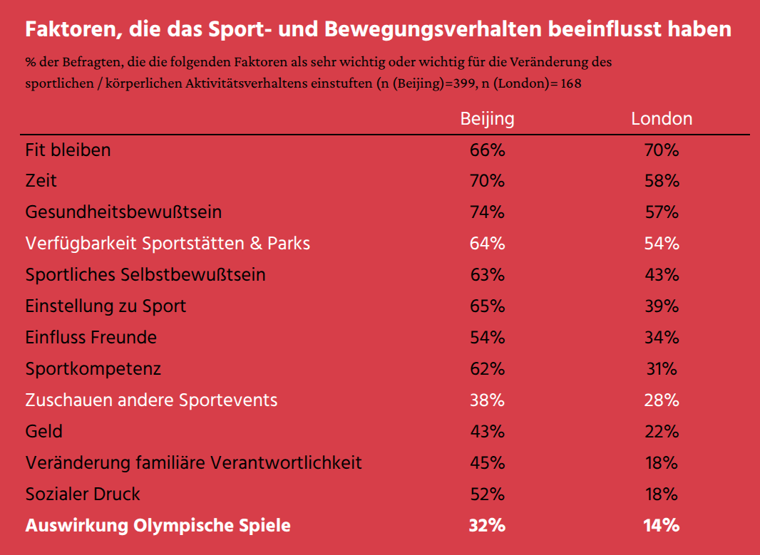 Laut dem Datenportal Statista haben sich 48% der Deutschen für das 2026 vorgenommen, mehr Sport zu treiben. Eine Studie der University of Birmingham hat die Langzeiteffekte von Olympischen Spielen auf die Neigung Sport zu treiben anhand der Spiele von Beijing (2008) und London (2012) untersucht1. Die Verfasser stellen fest: “Es ist festzustellen, dass die inspirierende Wirkung der Olympischen Spiele zwar als Auslöser für Veränderungen im Teilnahmeverhalten nachweisbar wurde, diese Effekte jedoch als weniger bedeutend als andere grundlegende intrinsische (Sportkompetenz, Sporteinstellung und Sportselbstvertrauen) und extrinsische Faktoren (Zugänglichkeit von Sportanlagen und Zeit) wahrgenommen wurden.”